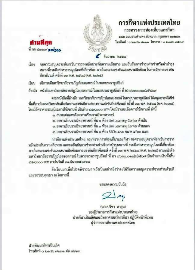 ในเรื่องนี้ นายปรีชา ลาลุน รองผู้ว่าการ ฝ่ายกีฬาเป็นเลิศและวิทยาศาสตร์การกีฬา การกีฬาแห่งประเทศไทย (กกท.) (ปฏิบัติหน้าที่แทนผู้ว่าการ กกท.)ได้มีหนังสือชี้แจงลงวันที่ 5 ธันวาคม ไปยัง มรภ.วไลยลงกรณ์ฯ เรียบร้อยแล้ว สรุปเนื้อหาดังนี้