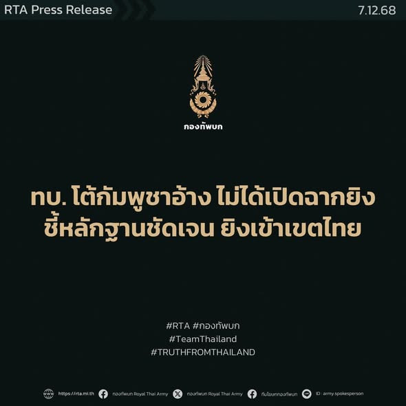 กองทัพบกโต้คําแถลงกัมพูชา หลังกล่าวหาไทยยิงก่อน — ชี้หลักฐานชัด “ทหารกัมพูชาเปิดฉากยิงใส่กําลังพลไทยระหว่างปฏิบัติหน้าที่ในเขตไทย ทําบาดเจ็บ 2 นาย”