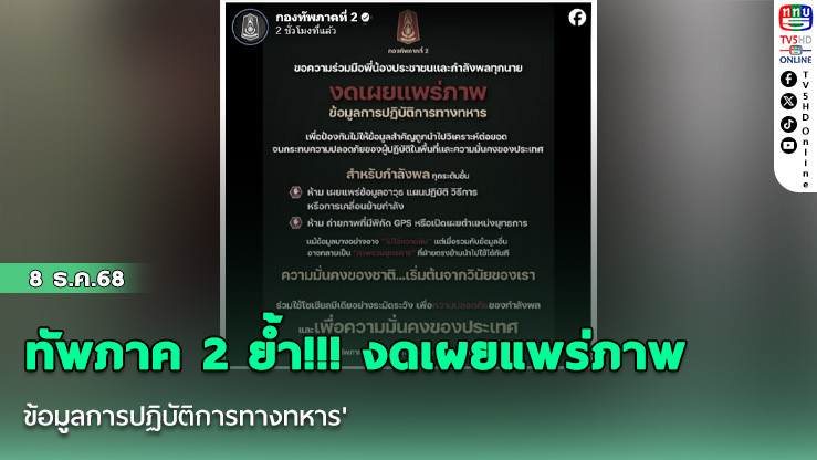 เมื่อวันที่ 8 ธันวาคม 2568 เพจเฟซบุ๊ก "กองทัพภาคที่ 2" โพสต์ข้อความระบุว่า งดเผยแพร่ภาพ "ข้อมูลการปฏิบัติการทางทหาร" กองทัพภาคที่ 2 ขอความร่วมมือพี่น้องประชาชนและกําลังพลทุกนาย งดเผยแพร่ภาพ "ข้อมูลการปฏิบัติการทางทหาร" เพื่อป้องกันไม่ให้ข้อมูลสําคัญถูกนําไปวิเคราะห์ต่อยอด จนกระทบความปลอดภัยของผู้ปฏิบัติในพื้นที่และความมั่นคงของประเทศ