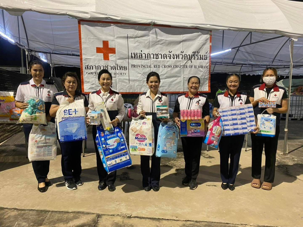 เหล่ากาชาดจังหวัดบุรีรัมย์ได้ตั้งจุดสนับสนุนด้านอาหาร น้ําดื่ม และสิ่งของอุปโภค–บริโภค พร้อมส่งชุดปฏิบัติลงพื้นที่ศูนย์อพยพเพื่อดูแลกลุ่มเปราะบาง เช่น ผู้สูงอายุ เด็กเล็ก ผู้ป่วย และผู้พิการอย่างใกล้ชิด