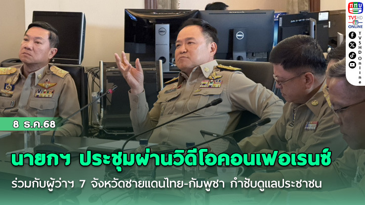 8 ธันวาคม 2568 - เมื่อเวลา 12.00 น. ที่ห้อง Pmoc ชั้น 2 ตึกไทยคู่ฟ่า ทําเนียบรัฐบาล นายอนุทิน ชาญวีรกูล นายกรัฐมนตรีและรมว.มหาดไทยประชุมผ่านระบบวิดีโอคอนเฟอเรนซ์ร่วมกับผู้ว่าราชการ 7 จังหวัดชายแดนไทย-กัมพูชา ประกอบด้วย ตราด จันทบุรี สระแก้ว บุรีรัมย์ สุรินทร์ ศรีสะเกษ และอุบลราชธานี