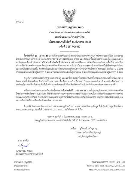 เมื่อเวลา 05.00 น.วันที่ 9 ธันวาคม 2568 กรมอุตุนิยมวิทยา ประกาศเรื่อง ฝนตกหนักถึงหนักมากบริเวณภาคใต้ และคลื่นลมแรงบริเวณอ่าวไทย (มีผลกระทบจนถึงวันที่ 16 ธันวาคม 2568) ฉบับที่ 2 ดังนี้