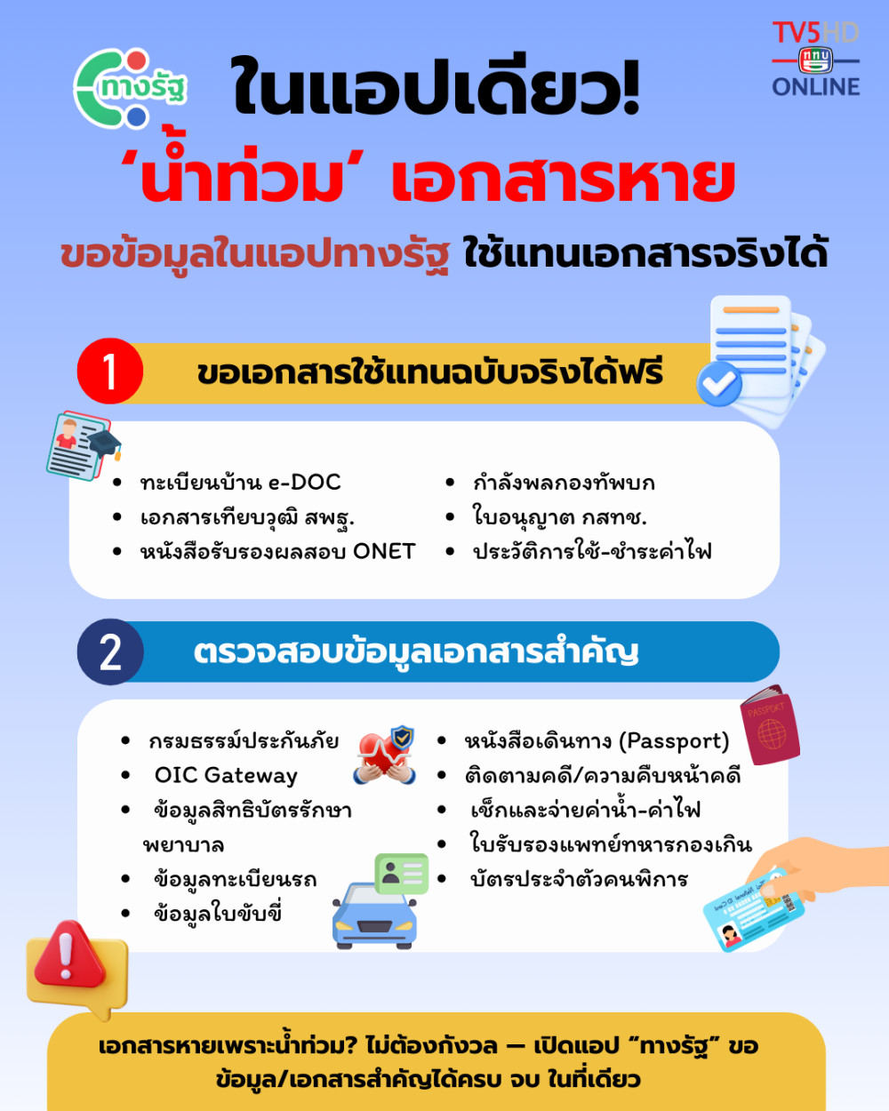 จากสถานการณ์น้ําท่วมในหลายพื้นที่ ทําให้ประชาชนจํานวนมากประสบปัญหาเอกสารราชการสูญหายและชํารุด ล่าสุดภาครัฐได้เปิดให้ประชาชนสามารถใช้แอป “ทางรัฐ (Tang Rat)” ในการขอเอกสารสําคัญและตรวจสอบข้อมูลส่วนตัวได้แบบครบวงจร ลดขั้นตอนและช่วยอํานวยความสะดวกในช่วงเวลาวิกฤต