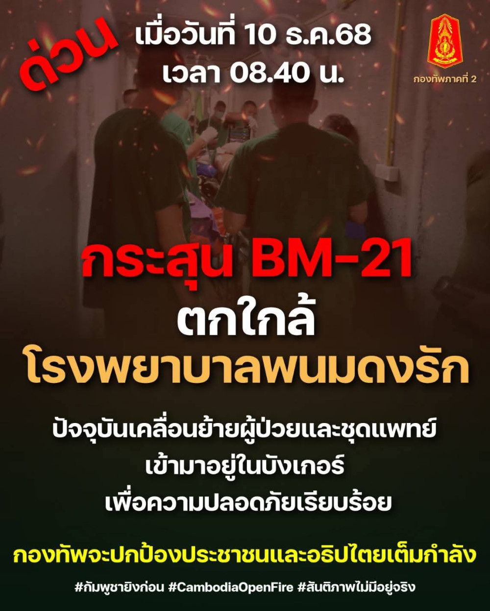08.40 น. ( 10 ธ.ค68 ) เขมรยิง BM-21 ตกใกล้โรงพยาบาลพนมดงรัก ล่าสุดเคลื่อนย้ายผู้ป่วยและชุดแพทย์ไปหลบในบังเกอร์เพื่อความปลอดภัย กองทัพจะปกป้องประชาชนและอธิปไตยเต็มกําลัง