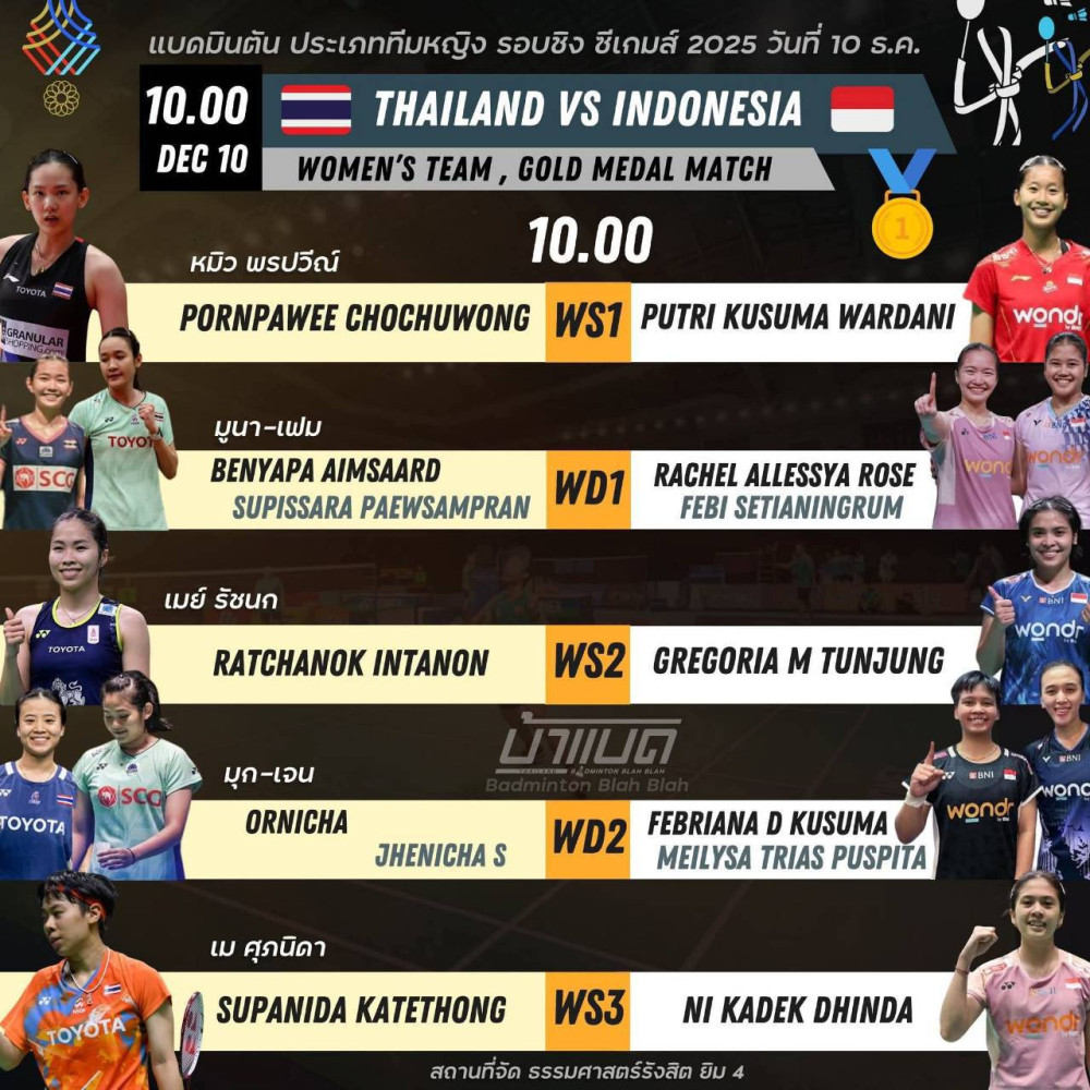 วันนี้(10 ธ.ค.) เวลา 10.00 น. แบดมินตันซีเกมส์ ประเภททีมหญิงนัดชิงชนะเลิศ จะเป็นการพบกัน ระหว่าง ทีมชาติไทย พบกับ ทีมชาติอินโดนีเซีย ถ่ายทอดสดทางช่อง NBT