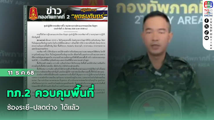ศูนย์ปฏิบัติการกองทัพภาคที่ 2 รายงานสถานการณ์ตามแนวชายแดนไทย–กัมพูชา ประจําวันที่ 11 ธันวาคม 2568 เวลา 09.00 น. ว่า ตามที่ได้เกิดการสู้รบตามแนวชายไทย-กัมพูชา ศูนย์ปฏิบัติการกองทัพภาคที่ 2 ขอสรุปผลการปฏิบัติที่สําคัญดังนี้