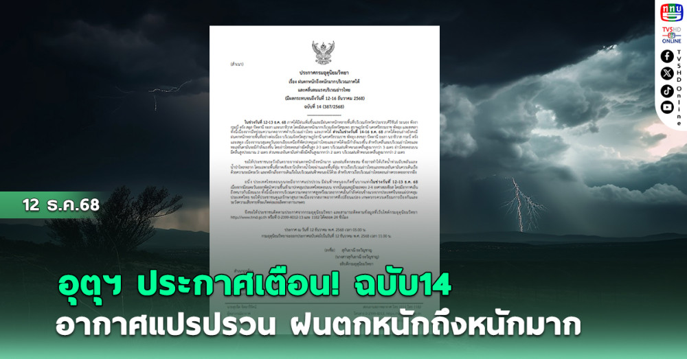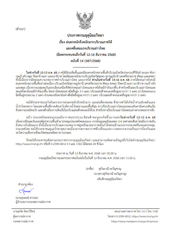 วันที่ 12 ธ.ค.2568 กรมอุตุนิยมวิทยา ประกาศ เรื่อง ฝนตกหนักถึงหนักมากบริเวณภาคใต้ และคลื่นลมแรงบริเวณอ่าวไทย (มีผลกระทบจนถึงวันที่ 12-16 ธันวาคม 2568) ฉบับที่ 14 (387/2568) ระบุว่า