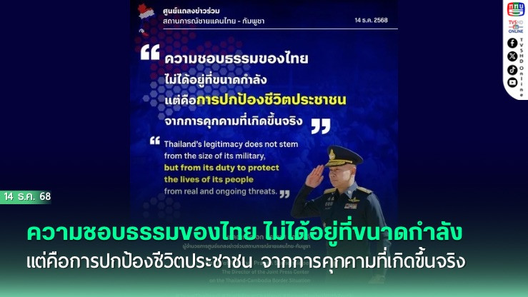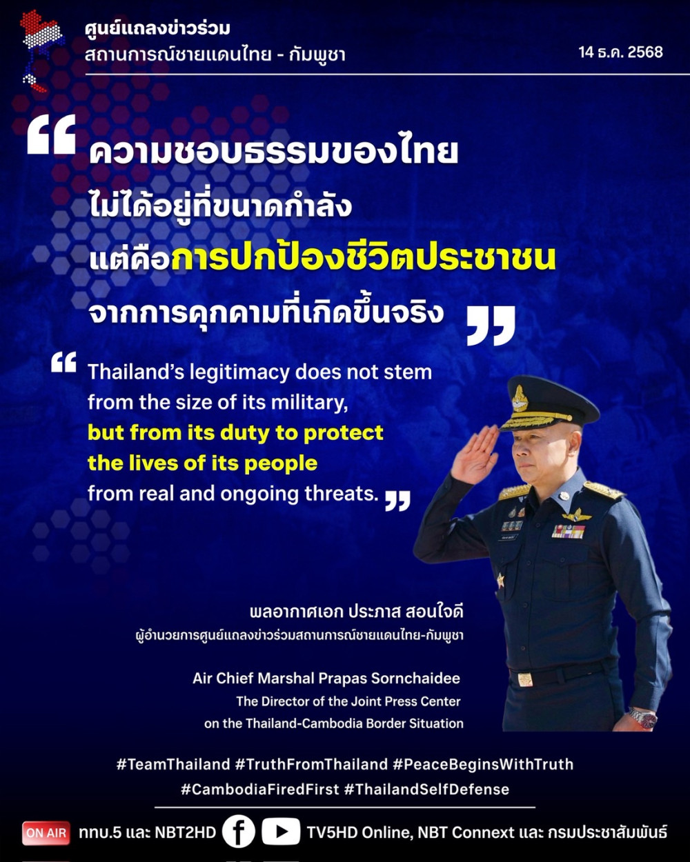 วันที่ 14 ธ.ค.68 - พลอากาศเอก ประภาส สอนใจดี ผู้อํานวยการศูนย์แถลงข่าวร่วมสถานการณ์ชายแดนไทย–กัมพูชา ชี้แจงต่อสาธารณชนไทยและนานาชาติว่า การพิจารณาข้อตกลงหยุดยิงใด ๆ จําเป็นต้องเกิดจาก ความเห็นพ้องร่วมกันของทั้งสองฝ่าย และที่สําคัญต้องพิจารณาจาก การกระทําที่แท้จริงของกัมพูชา ว่ามีความจริงใจหรือไม่