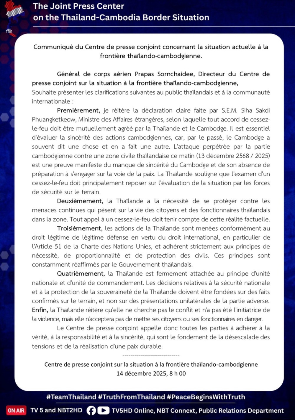 ศูนย์แถลงข่าวร่วมฯ ย้ําว่า ประเทศไทย ไม่ได้แสวงหาความขัดแย้งและไม่ใช่ฝ่ายเริ่มใช้ความรุนแรง แต่จะไม่ยอมให้ประชาชนหรือเจ้าหน้าที่ของไทยตกอยู่ในภาวะอันตราย พร้อมเรียกร้องให้ทุกฝ่ายยึดมั่นใน ความจริง ความรับผิดชอบ และความจริงใจ ซึ่งเป็นรากฐานสําคัญของการลดความตึงเครียด และนําไปสู่สันติภาพที่ยั่งยืนในอนาคต