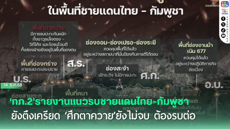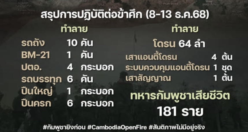 14 ธันวาคม 2568 กองทัพภาคที่ 2 รายงานสถานการณ์การสู้รบในพื้นที่ชายแดนไทย-กัมพูชา สรุปการปฏิบัติต่อข้าศึก (8-13 ธ.ค.68) ทําลาย รถถัง 10 คัน, โดรน 64 ลํา, BM-21 1 คัน, เสาแอนตี้โดรน 4 ต้น, ปตอ. 4 กระบอก, ระบบควบคุมแอนตี้โดรน 1 ชุด, รถบรรทุก 6 คัน, เสาสัญญาณ 1 ต้น, ปืนใหญ่ 1 กระบอก, ปืนครก 6 กระบอก และทหารกัมพูชาเสียชีวิต 181 ราย