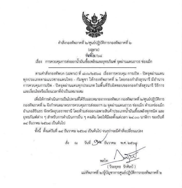 ผู้สื่อข่าวรายงานสถานการณ์ชายแดนไทย-กัมพูชา โดยวานนี้(14 ธ.ค.)ว่า พล.ท.วีระยุทธ รักศิลป์ แม่ทัพภาค 2 ได้ลงนามในหนังสือการควบคุมการส่งออกน้ํามันเชื้อเพลิง และยุทธภัณฑ์ จุดผ่านแดนถาวรช่องเม็ก เริ่มตั้งแต่เวลา 24.00 น. (15 ธ.ค.) เป็นต้นไป ตามคําสั่งกองทัพบก (เฉพาะ) ที่ 806/2568 เรื่องการควบคุม การเปิด - ปิดจุดผ่านแดน ทุกประเภทตามแนวชายแดนไทย - กัมพูชา ให้กองทัพภาคที่2 โดยกองกําลังสุรนารี มีอํานาจ การควบคุมการเปิด - ปิดจุดผ่านแดนทุกประเภท ในพื้นที่รับผิดชอบ วิธีการและเงื่อนไขหรือเงื่อนเวลาที่จําเป็นเหมาะสม เพื่อให้การดําเนินการเป็นไปด้วยความเรียบร้อย