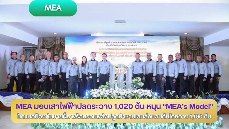 กิจกรรมในครั้งนี้ พนักงาน MEA มาร่วมพลังแสดงความรับผิดชอบต่อสังคมและสิ่งแวดล้อม ผ่านการฟื้นฟูและบํารุงรักษาป่าชายเลนซึ่งเป็นปราการธรรมชาติที่สําคัญในการป้องกันแผ่นดินหายจากการถูกกัดเซาะของคลื่นทะเล พร้อมทั้งนํา MEA's Model มาประยุกต์ใช้เพื่อความยั่งยืน