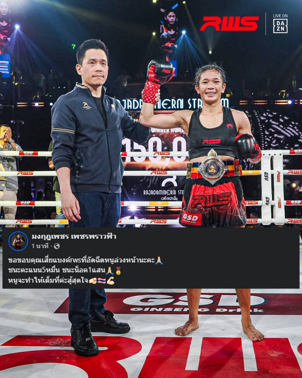 แต่สิ่งที่เรียกเสียงฮือฮาในโลกโซเชียลไม่น้อย คือโพสต์ล่าสุดของ “มงกุฎเพชร” ที่เผยว่า “คุณแบงค์” เธียรชัย พิสิฐวุฒินันท์ ประธานรายการราชดําเนินเวิลด์ซีรีส์ (RWS) และหนึ่งในบอร์ดบริหารเวทีราชดําเนิน ได้มอบขวัญและกําลังใจผ่านทีมงาน ด้วยการประกาศ "อัดฉีด" เงินรางวัลก้อนโตให้เธอหากสามารถคว้าเหรียญทองกลับมาได้