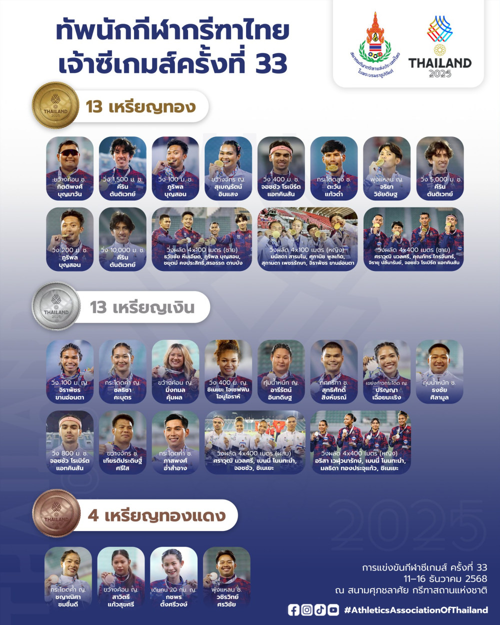 16 ธันวาคม 2568 – สนามศุภชลาศัยระอุไปด้วยเสียงเชียร์ เมื่อทีมกรีฑาไทยโชว์ฟอร์มโหดในวันสุดท้ายของการแข่งขันซีเกมส์ ครั้งที่ 33 คว้าเพิ่มอีก 2 เหรียญทอง ส่งท้ายมหกรรมกีฬาด้วยผลงานระดับมาสเตอร์ ครองเจ้ากรีฑาอีกสมัย รวม 13 เหรียญทอง!