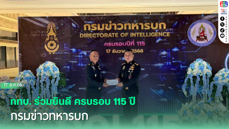 วันที่ 17 ธันวาคม 2568 - สถานีวิทยุโทรทัศน์กองทัพบก (ททบ.) โดย พลโท อาวุธ พุทธอํานวย กรรมการผู้อํานวยการใหญ่ สถานีวิทยุโทรทัศน์กองทัพบก เข้าร่วมแสดงความยินดีต่อ พลโท ธีรนันท์ นันทขว้าง เจ้ากรมข่าวทหารบก เนื่อในโอกาสครบรอบ 115 ปี กรมข่าวทหารบก พร้อมร่วมบริจาคเงินสมทบเข้ากองทุนสวัสดิการให้แก่กําลังพลและครอบครัว