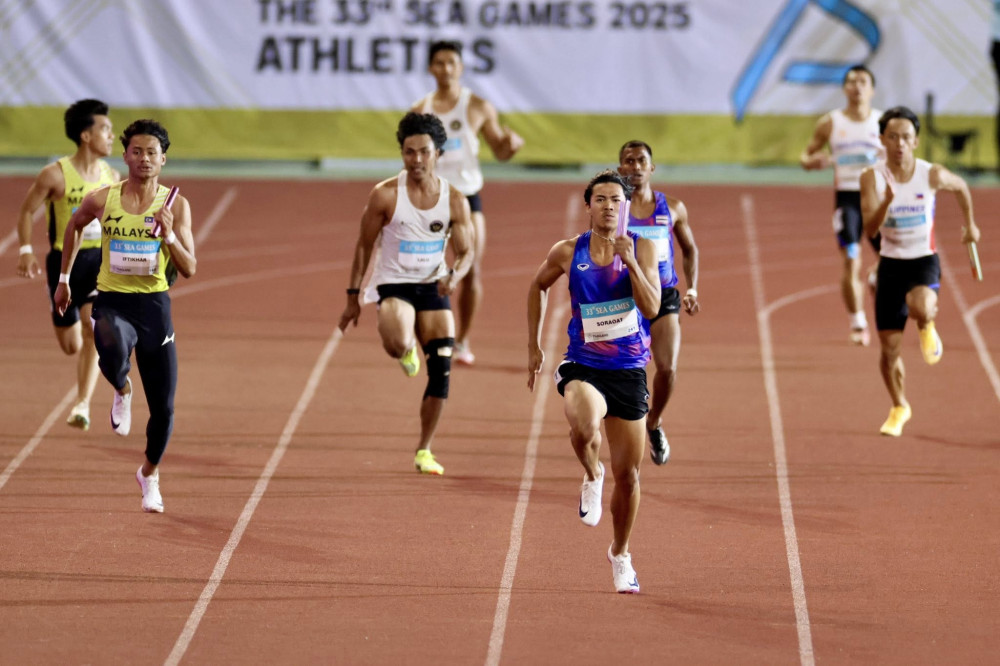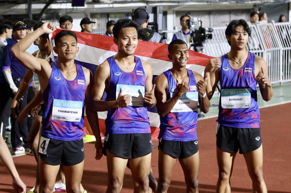 ในการแข่งขันซีเกมส์ล่าสุด ทีมชาติไทยที่ประกอบด้วย “บิว” ภูริพล บุญสอน, “โอ๊ต” ธวัชชัย หีมเอียด, “ก๊วย” ชยุตม์ คงประสิทธิ์ และ “ต้า” สรอรรถ ดาบบัง วิ่งฝ่ากระแสความกดดันเข้าเส้นชัยเป็นทีมแรก ด้วยเวลา 38.28 วินาที